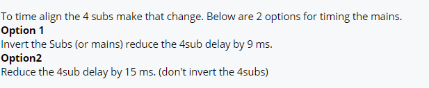 Option 2, has the 4sub group arriving ½ wavelength earlier and crosses the phase near the XO frequency. This option appears to provide slightly better phase tracking considering the room impact on phase at the LP.