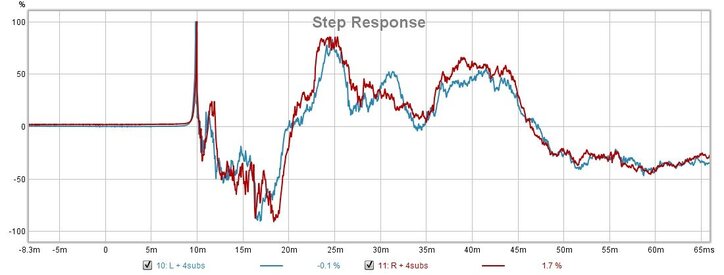 > The resulting overlay of the step response of the L + 4subs and R + 4subs will look as shown below.